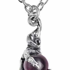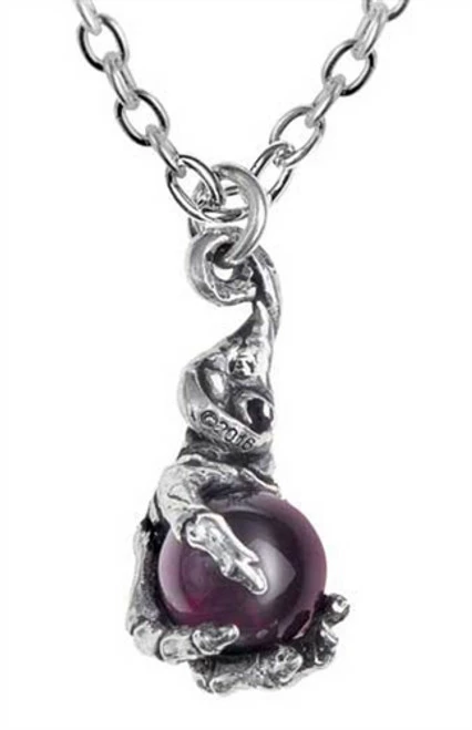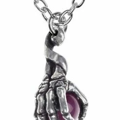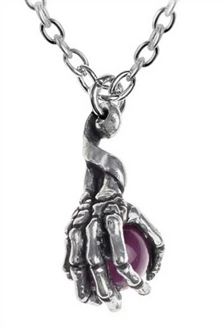 A small pewter pendant of a skeletal hand holding a topaz purple glass orb.