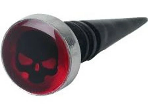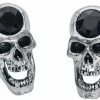 Giving the firm appearance of a spike-stretched earlobe, the black face of ruin glares out from a red hell-hole atop the black spiked stud