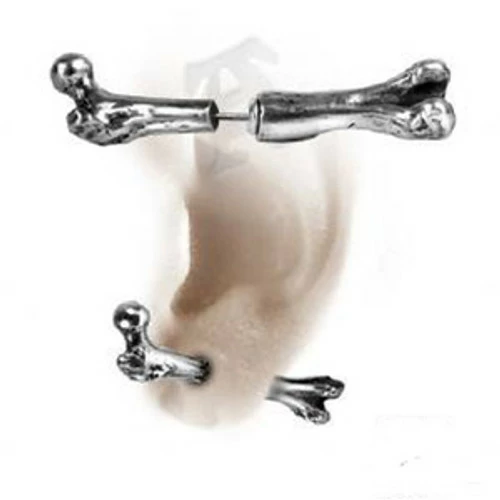 This Alchemy Femur Bone Faux Stretcher Earring is a polished pewter, silver post ear stud for regular pierced ears, with special and thoroughly convincing backs appearing exactly like a stretched ear.