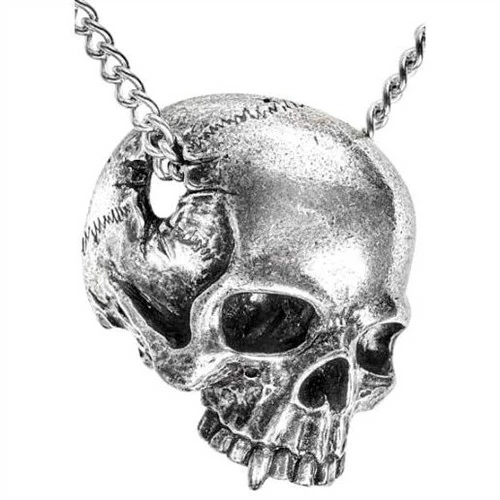 The “Remains” Pendant by Alchemy is a jawless human skull representation, (with a suspiciously vampiric canine tooth) in 3/4 view with a large temporal perforation, through which the pendant chain passes.