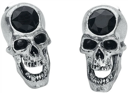 Screaming Skull studs by Alchemy, a pair of discreet pewter skull ear studs with their jaw wide open and a black Swarovski crystal set into its dome.