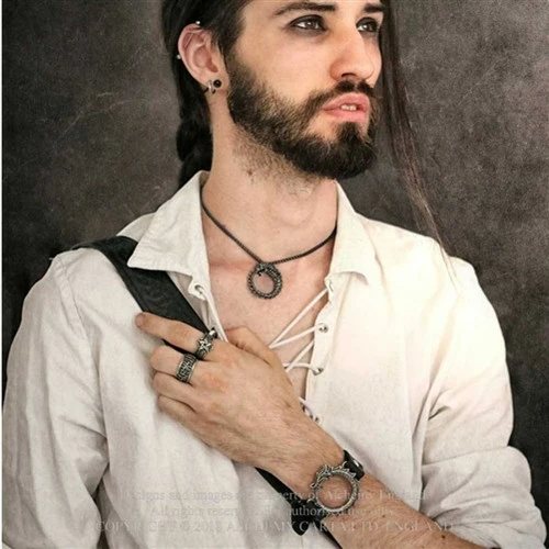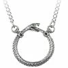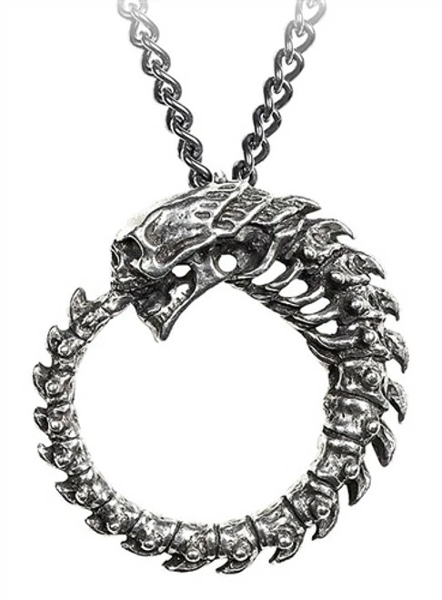 A pewter ouroboros eternity ring pendant in the form of an ‘alienesque’ spined vertebrae with a skull.