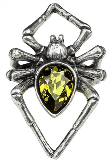 A giant spider, polished pewter ring with a large emerald green Swarovski crystal body.