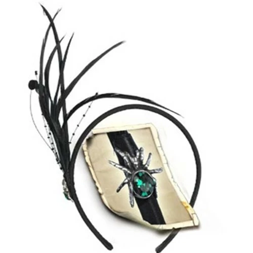 A fabulous spray of jet-black feathers on a black lace-covered band, accented with a delicate, crystal-set spider.