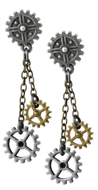 A pair of small, antiqued pewter gear wheel studs, with fine bronzed chains suspending two further, smaller, two-tone cogs; on surgical steel ear-wires.