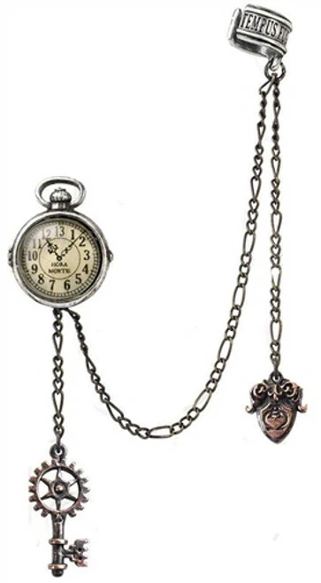 This Alchemy earring comes with the perfect miniature, 13-hour Lunar time fob watch and its accoutrements from the Victorian era, two-tone copper and pewter with glass imitation watch face, ingeniously cuffed and pinned around the fortunate dandy s ear.