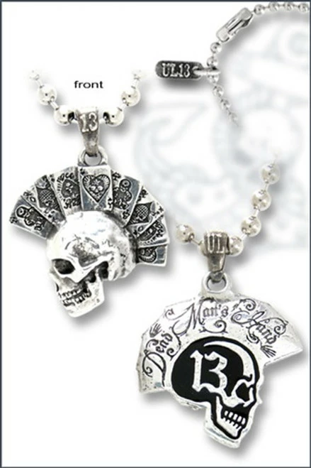 Sculpted skull with ‘Aces of Death’ mohican and engraved & enamelled reverse. On 4.5mm ball chain.