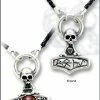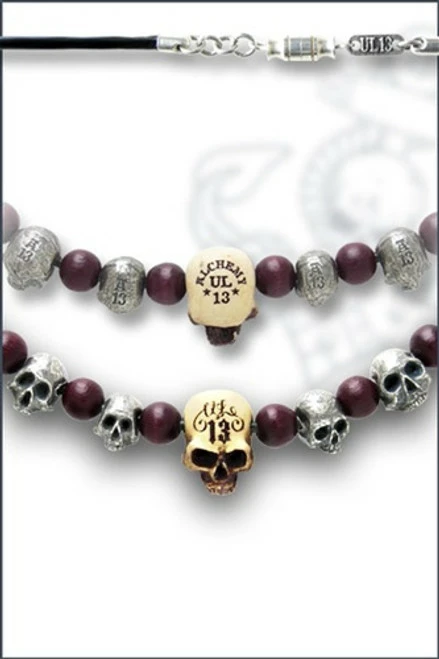 ‘Trophy’ necklace with bone resin central skull and mixed pewter skull and dark wooded beads. Each skull is UL13 ‘branded’. On leather thong. Bead section approx 14 cm long.