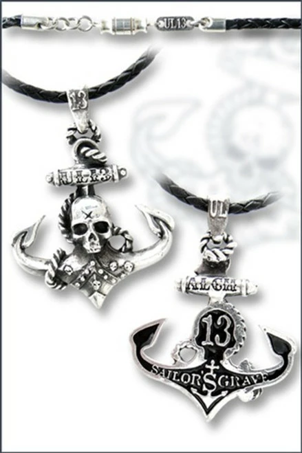 Traditional seafarers anchor with skull barnacles and black enamelled back. On plaited leather thong.