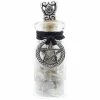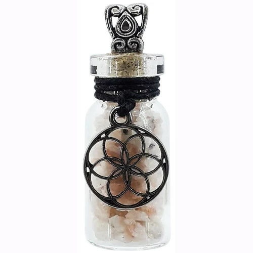A glass bottle filled with sunstone crystal chips and decorated with a seed of life charm – ideal for creative endeavours – or use for your own magickal associations